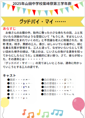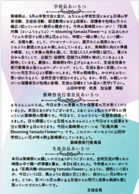 今年の紫峰祭スローガン:『彩風共舞(さいふうきょうぶ)~ Blooming Yamada Flower ~』に込められた「どんな状況であっても咲き誇る花のように、仲間と一緒に輝こう」という願いが、合唱や劇、そして、プレゼンテーション、展示などの発表の中でしっかりと表現されていて、多くの参観者が感動されていました。また、鑑賞のマナーもとても素晴らしかったです。