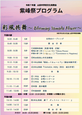 いよいよ明日(10月10日)、紫峰祭の当日を迎えます。この日まで、実行委員会を中心に、準備を入念に進めてきました。生徒たちの本番での活躍をぜひ楽しみにしてください。たくさんの保護者や地域の方々の御参観をお待ちしております。