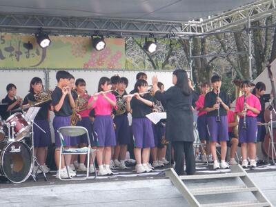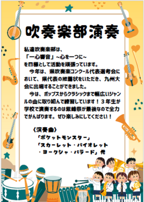 8月23日(土)に開催された第70回九州吹奏楽コンクールへの出場に際して、地域の方々から多くの温かい支援をいただいたことに深く感謝し、まつりを盛り上げたいという気持ちで演奏を披露しました。また、1年生7名は、演奏に合わせた創作ダンスも披露してくれました。