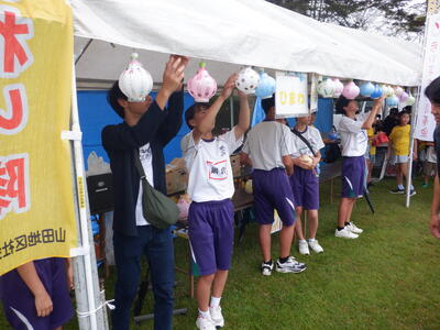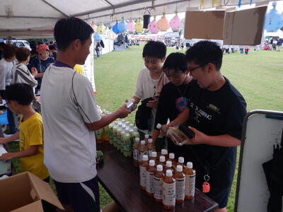 10月11日(土)、かかし村まつり会場において、社会福祉協議会(ひまわり隊)による募金活動やテントの飾り付け、販売活動のお手伝いをするボランティアに6名の生徒が参加しました。