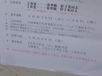 10月15日(水)、任期満了に伴う生徒会総務役員5名の改選に向けて、立候補者12名の選挙ポスター掲示とお昼の放送での演説活動がスタートしました。