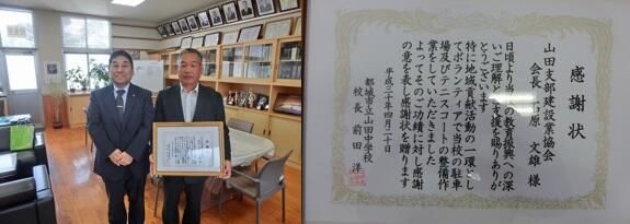 4月20日(金)、山田支部建設業協会会長の石原文雄様を本校の校長室にて表彰させていただきました。地域貢献活動の一環として、駐車場やテニスコートの整備をしていただいたことへの感謝の意を表すためです。