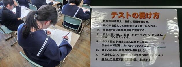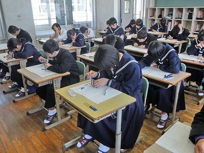 1校時は英語、2校時は数学という日程でした。どの生徒も真剣な面持ちでテストに臨んでいました。何人かの生徒にテストの感想を聞いてみました。「両方ともできた。」、「数学はできたけど、英語はできなかった。」、「英語はできたけど、数学はさっぱり・・・。」、「両方ともできなかった。聞く相手を間違えています。」と、生徒の反応は様々でした。