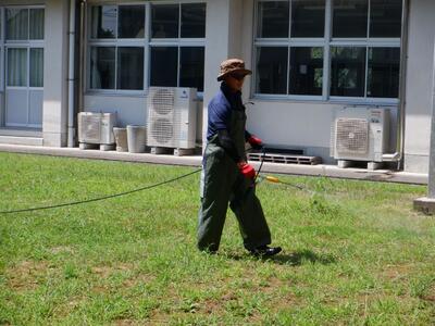 今回は、プールや中庭周辺に除草剤を散布していただいたり、グラウンド周辺の草刈りを行っていただきました。現在、グラウンドで活動している部活動がないため、グラウンド内の雑草が元気に生えてくるのに困っているところでしたので、大変助かりました。