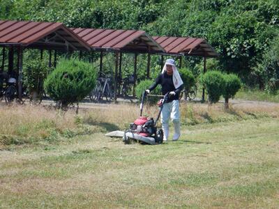 7月15日(火)、昨日までの雨模様から一転、まぶしい太陽が戻ってきた猛暑の中、環境整備員の方が前回の除草作業の続きを行ってくださいました。