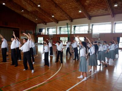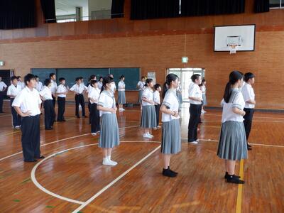 7月16日(水)の昼休み、山田地区一斉ラジオ体操【8月9日(土)予定】に向けた中学生ボランティアの打合せ会及び練習会を実施しました。