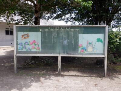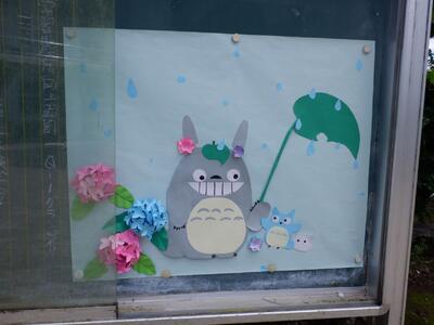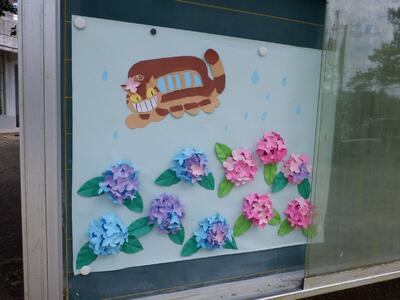 山田中学校の正門付近の掲示板の様子です。梅雨の時期にふさわしく、宮崎駿作品「となりのトトロ」とあじさいの花をコラボした、とてもかわいい生徒作品が掲示してあります。