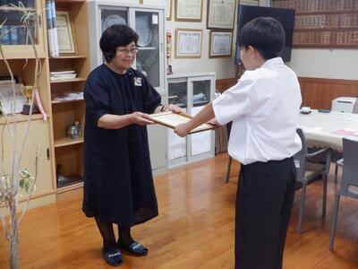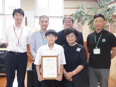 該当生徒は、小学6年生時に、毎日欠かさず、朝のボラティア活動に参加し、学校美化に多大な貢献を果たしたことが認められ、今回の受賞につながりました。