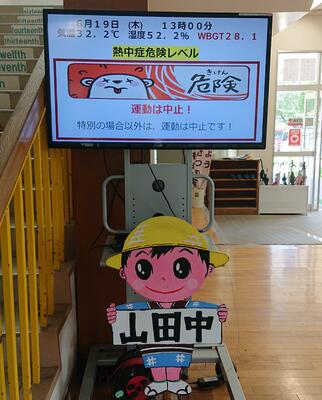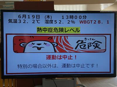 6月19日(木)、13時において、熱中症指数(WBGT)が、28.1になり、昼休みの外遊びを制限しました。 熱中症対策として、養護教諭が、玄関ホールにおいて、1日3回、熱中症指数を更新し、生徒及び職員への注意喚起を行っています。