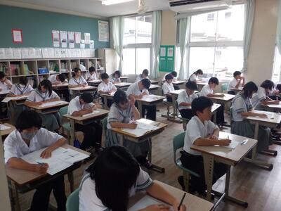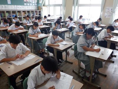 6月24日(火)、1学期末テストの1日目が行われました。1年生にとっては、今回が初めての校内定期テストになります。緊張した表情で、問題に向き合っている姿が見られました。中学校に入学してからの学習内容が確実に身に付いているかを測る大事なテストです。これまでの授業を思い起こしながら、最後まで何度も見直しをしましょう。