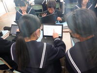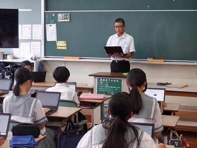 第1学年の保健体育の授業では、「誰でも楽しめるスポーツ」を考え、仲間に伝え合う取組を行いました。生徒は端末機(タブレット)を活用して、体力や技能の程度、性別等の違いを踏まえて、自分の意見を書き込んだり、その考えを発表したりしました。