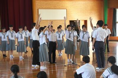 生徒会長の原田さんは、これまでの生徒会活動を振り返り、「スピーチコンテストグランプリなどの新たな挑戦ができた。その活動を通して、皆さんの成長につながったと思う。これからの山田中をよろしくお願いします。」と述べました。