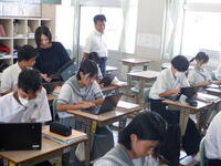 第2学年の数学では、多角形の内角の和を求める方法を学習しました。生徒は端末機(クロムブック)でデジタル教科書を活用しながら、いろいろな多角形の内角の和を調べていました。多角形をいくつかの三角形に分け、三角形の内角の和と多角形の内角の和にどのような関係があるのかを考える授業でした。n角形の内角の和を文字式で表す公式を利用することで、手早く問題が解けることに意欲・関心を持ち、練習問題に取り組んでいました。