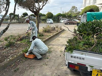 月に2回、都城市教育委員会の作業員の方に、草刈りや樹木の剪定、不要物の搬出など、学校の環境美化作業をしていただいています。