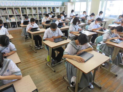 今回、タブレットを使っての学習コンテストを全学年で実施した。生徒たちは真剣に 取り組んでいた。今後もいろいろな形でタブレットを活用できるようにしていきたい。
