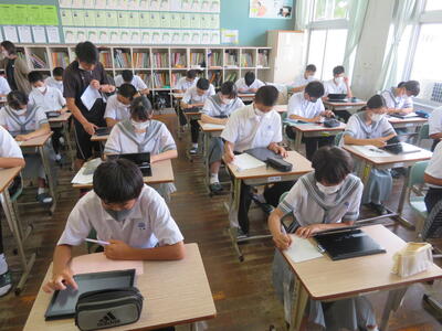 写真は、10月13日(木)の2校時の様子です。1年生は社会、2年生は英語、3年生は理科のテストに取り組んでいました。どの学年も空欄をつくらないように、一生懸命に思い出しながら回答欄を埋めている様子でした。