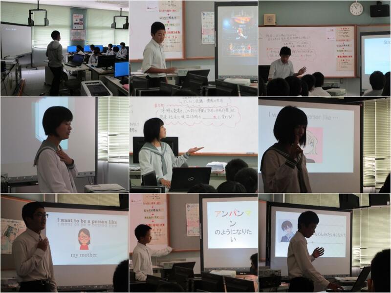 10月29日(木)、黒木先生による2年1組、2年2組の英語の授業公開を行いました。My Projet「こんな人になりたい」というテーマを元に、自分でスピーチ原稿を考え、それを覚えて発表しました。プレゼン能力も同時につけるという狙いで、生徒たちが自分自身でプレゼンテーションを作り、英語で発表しながら自分でプレゼンを操作するという取り組みをしました。インターネットを使って情報を集め、自分でプレゼンを作ることにより、今年度のテーマであるメディアとの関わり方を授業に生かした授業となりました。生徒はしっかりと原稿を覚え、ジェスチャーを使いながらプレゼンを行っていました。非常にレベルが高く、表現力をのばせる授業でした。