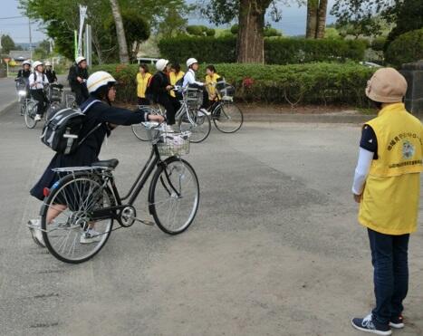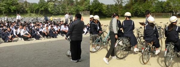 4月12日(木)の6校時、全校生徒を対象に交通安全教室を開きました。内容は、自転車点検、自転車通学上のルールについての確認でした。