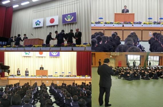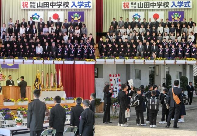 その他、教育委員会、PTA会長様からもお祝いや激励の言葉をいただききました。おかげをもちまして、男子37名、女子21名、計58名の新入生は、期待に胸を膨らませながら新しい生活をスタートさせることができました。