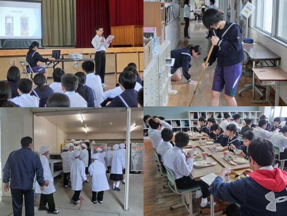 服装、給食や清掃についても山田中学校には、山田中学校なりのルールがあります。それらについての説明を各担当の先生がしたり、生徒会役員が自主的にしたりしました。給食指導と清掃指導については、全体説明の後、実際に動いてみて、先生方が指導に当たりました。