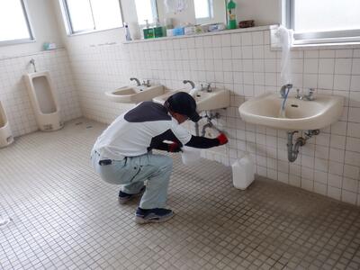 7月10日(金)、教育政策課の技術員の方が来校してしていただき、2年男子トイレの洗面台下のタイル補修を行ってくださいました。日頃から軽微な修繕は、職員でも行っていますが、今回のように、技術を要する修繕はなかなか困難なため、大変助かっています。