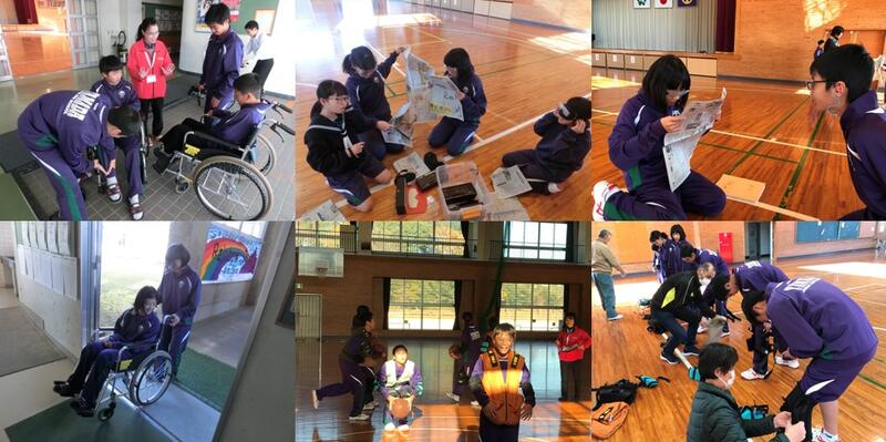 体験内容は、車イスの体験、耳栓、視野狭窄メガネをかけた高齢者疑似体験でした。車イスの体験では、乗る方、操作する方を体験し、車イスに乗っている人の気持ちを考え、校舎内を移動しました。高齢者疑似体験では、耳栓、視野狭窄メガネをかけた状態で新聞を読んだり、カルタ遊びをしたりしました。また、肘・膝サポーターや錘付きベストを着用した状態でバスケットボールをすることで、高齢者の動きを体感することができました。