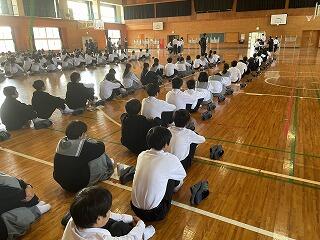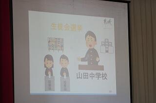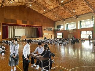 都城市の選挙管理委員会の皆様にお越しいただき、全校生徒を対象に、選挙の意義について考える授業を実施しました。