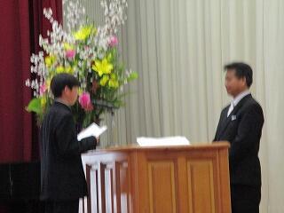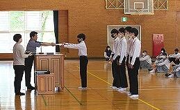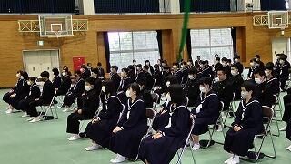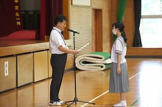 1、2年生で体育館にきちんと整列し、まずは卓球部の表彰でした。修了式では、最初に学年と生徒会の代表による1年間の反省。1年生は黒木海那さん、2年生は東 涼介さん、生徒会は新山南風通さんの3名が、この一年間を振り返って成長したと実感していること、次年度へ向けての課題、次年度の目標などを堂々と発表してくれました。