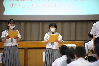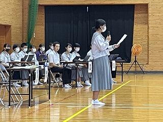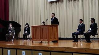その後、卒業生代表の宮元七惺さんが卒業記念品の授与を受け、2年の中島心愛さんが、優しい口調で在校生を代表して送辞を述べてくれました。それに答えて、旧生徒会長の石原徠雅さんが答辞を述べてくれました。コロナ禍で多くの制限を受けながら送った3年間を振り返りながら、「思い出深いものとなった」と語るように述べてくれました。本当にすばらしい答辞でした。