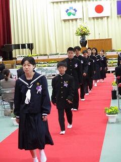 8時半ごろから保護者の来場で慌ただしくなりましたが、入場開始15分前にはスクリーンに音楽とともに卒業生の顔写真のスライドショーが映し出され、そのまま会場は静まりかえりました。都城市教育委員会と学校運営協議会の皆様が式場に案内され、吹奏楽部の「威風堂々」の演奏に合わせて卒業生入場。