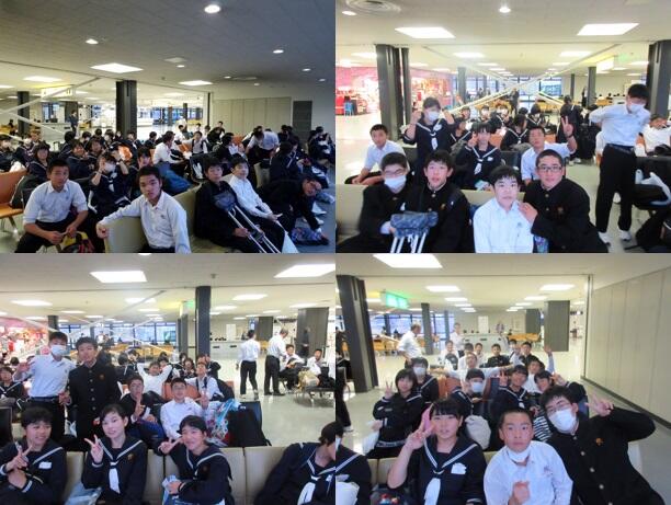 予定では、空港で解散式をした後、6時50分には宮崎空港を出発し、山田中学校へ向かいます。予定より早くなる可能性がありますが、空港を出発したら、保護者の皆様には安心安全メールで一斉送信します。今しばらくお待ちください。
