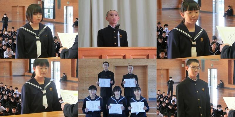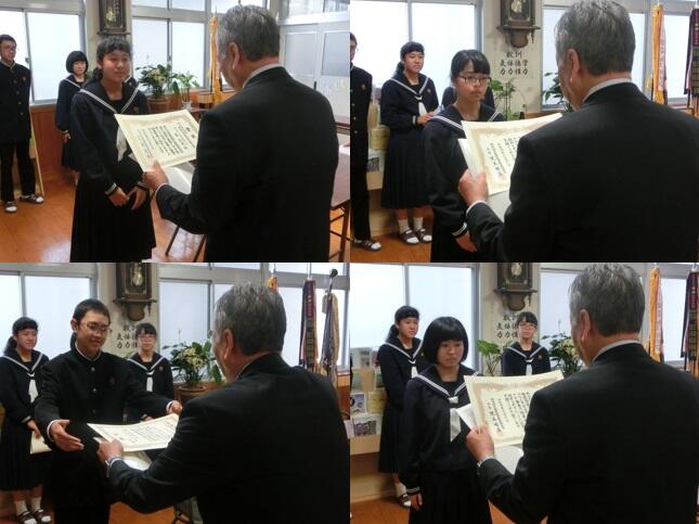 都城地区租税教育推進協議会が主催する税についての中学生の作文に応募し、上位の成績を修めた生徒の表彰が、11月27日(水)、校長室で行われました。都城・北諸県地区納税貯蓄組合連合会長の東様、都城税務署の田中様が来校され、4名の生徒一人一人に賞状と記念品を手渡されました。