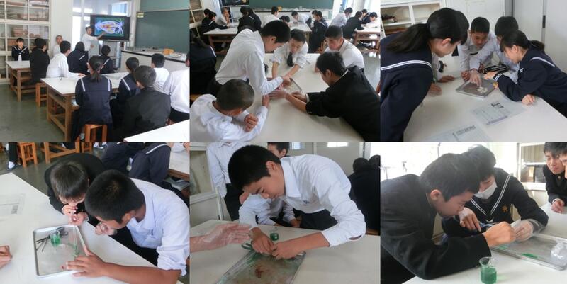 生徒は班ごとに1杯のイカをはさみやピンセットを使って解剖していきました。口の位置がわかったところで、口からインクを入れて、胃や肛門の位置を観察したり、目を取り出して固さなどを調べたりしました。