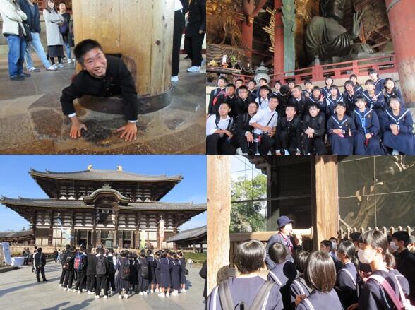 ただ今、奈良公園内の東大寺を見学中です。実物で見る大仏は、とても迫力があり、生徒も興奮しているようです。