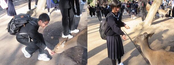 それだけ、奈良公園の鹿は人間慣れしているということでしょうか。生徒もその鹿の様子に驚いたようですが、鹿との交流(?)を楽しんだようです。