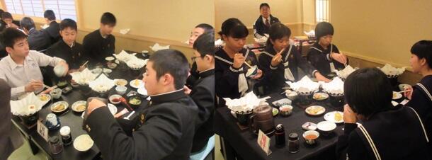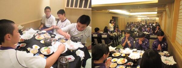 旅館からのサービスなのか、量も多かったようです。生徒は終日の研修でお腹も空いていたのでしょう、たくさん食べてどの班も完食していたようです。みんなでとる食事は何でもおいしいものです。これも修学旅行の良さなんでしょうね。