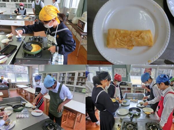 家庭で、料理の経験のある生徒、そうでない生徒様々で、悪戦苦闘する生徒も多く見られました。なかにはプロの料理人のように卵を格好良く割る生徒もいて、きれいに卵焼きを作っていました。