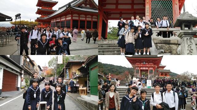まだまだ、自主研修は続いています。写真は先程と同じ清水寺及びその周辺の様子です。どうやら、清水寺はどの班も通過しないといけないチェックポイントとなっているようです。となると、清水の舞台が改修中というのがちょっと残念です。写真を見ていると、男子は学生服を脱いでカッターシャツになっていますが、暑いぐらい何でしょうか?