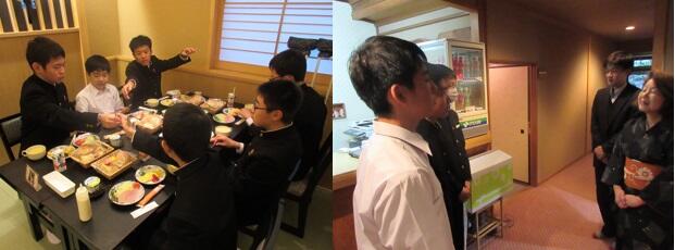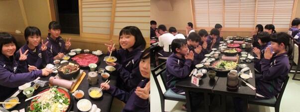 今日は早朝からの活動でしたので、お腹もすきました。ということで、旅館の夕食です。どうやら、豆乳鍋、グラタン、コロッケ・・・とどれもおいしそうです。1日の疲れをとり、あすの自主研修にむけてエネルギーを補給すべく、生徒はモリモリと楽しく食べていました。