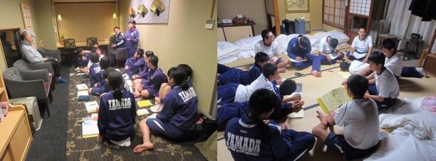 班長会・部屋長会では、この日の自主研修の報告、部屋長からの報告、実行委員からの話、先生からの話がありました。この後、各部屋で、部屋会を開き、次の日の行動予定や連絡事項を班員へ伝達しました。