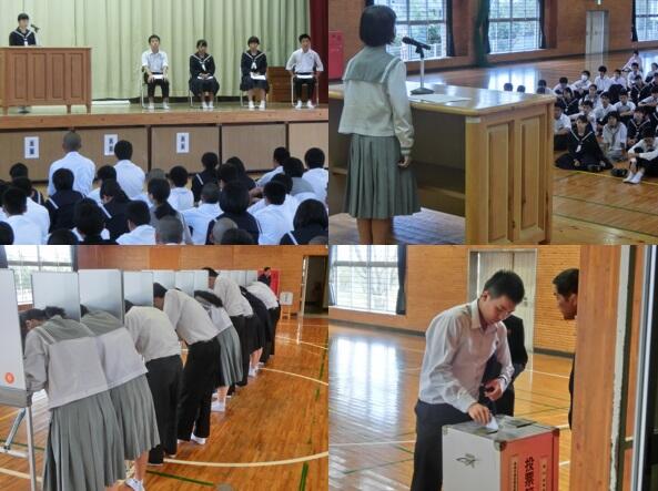 立候補者、1年生から4名、2年生から10名の立候補者が演説し、立候補の理由、当選した場合のマニフェスト(公約)を力強く述べました。実現できれば山田中学校がさらに素晴らしくなると予感させるマニフェストばかりで、頼もしく思えました。演説の後は、投票上の諸注意があり、市選挙管理委員会から借用してきた投票台、投票箱を使用して投票をしました。受付も実際の選挙どおりで、選挙権が与えられる18歳を近い将来に控える上でも貴重な経験となりました。