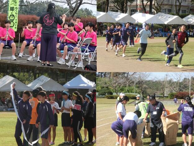 本校にも協力依頼があり、開会式での吹奏楽部の演奏や競技役員等に多くの生徒がボランティアで参加し、地域の行事に貢献できました。体育祭のスローガン「山田の思いよ一つになれ、一人のパワーが無限のパワーに!」は本校の2年生、谷口司君の考案で、開会式で表彰されました。この他、生徒は地区対抗のリレーや1000m走等にも参加し、体育祭を大いに盛り上げてくれました。