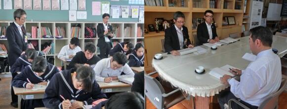 本校の最優先課題は、学力向上です。本校の取組について説明した後、全職員の授業を参観していただきました。その中で、生徒の落ち着いた授業態度や研究の成果が上がったところを評価していただきました。しかしその一方で、授業の中で生徒同士の話し合い活動の時間をどうやって確保するのか、1単位時間の授業の目標設定の在り方やその評価をどうするのか等いろいろご助言いただきました。