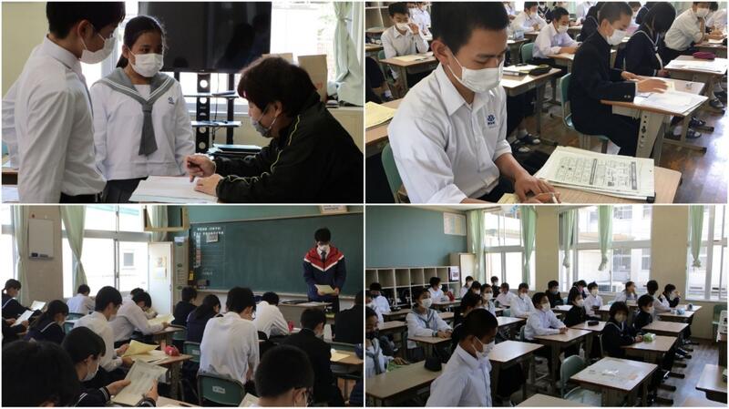 11月17日(火)、3年2組で堀内先生による英語の授業公開がありました。「Clean Energy Sources(きれいなエネルギー資源)」という単元で、教科書本文の内容について学習しました。事前に生徒たちにメディア等を活用し、エネルギー資源について調べてきてもらい、どのような資源を使った発電があるか発表してもらい、そこから風力発電の長所、化石燃料の短所についても考えていきました。単語の練習や、本文の音読の練習など声がしっかりとでていて、ジェスチャーも積極的に使って練習している様子が見られました。また積極的にペアで意見交換を行うなど、対話的な授業が展開されていました。