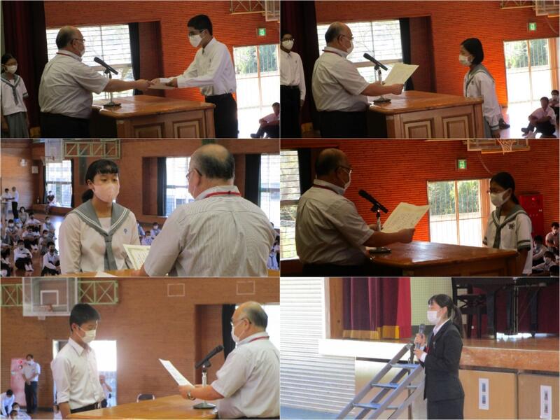 6月3日(水)、全校集会が行われました。新型コロナ対策として、いつもより生徒間の距離を開けて行いました。まず、表彰がありました。2年生の平澤史香さんが美術の賞をもらいました。臨時休校のためなかなか集会をする機会がなかったのですが、ようやく皆さんに紹介することができました。