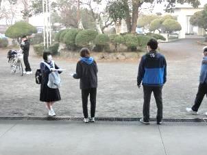 またこの日は、都城北消防署の消防士の方々に来ていただき、消火器の使い方を指導してくださりました。「ホッピング(ホース、ピン、グー(にぎる)」の順で消火器を扱ったり、火の根元を狙ってホースを向けるなど、生徒達は正しい使い方を学ぶことができました。各学年を代表して、1年生の池之上さん、2年生の大牟田浩さん、3年生の牛谷さんが実際に消化器を扱いました。貴重な体験をすることができました。