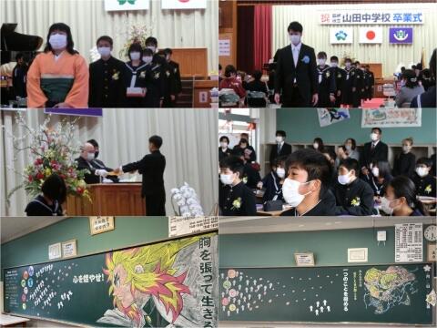 卒業式のあとは学級で最後の学活を行いました。担任の先生から1人ずつ卒業証書と先生が作ったオリジナルの卒業証書を受け取り、1人1人最後の挨拶を行いました。涙涙の感動的な締めくくりとなったようです。3年生は学年の仲が非常に良く、行事に燃え、とても強い絆で結ばれていました。山田中の歴史にすばらしい足跡を残してくれました。別れは寂しいですが、これから高校に進学し、すばらしい出会いがたくさん待っていると思います。希望を胸に山中生としての誇りをもち自信をもってがんばってください。山田中職員一同心より応援しています。