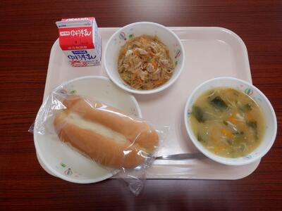 ・マヨネーズパン、春雨のピリ辛炒め、中華コーンスープ