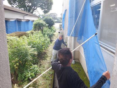 なお、今回は、校舎に近いところでの作業であることから、飛び石による窓ガラスのひび割れ等を防ぐために、防護ネットを張っていただきました。安全第一の丁寧な作業をしていただいたことに心から感謝いたします。