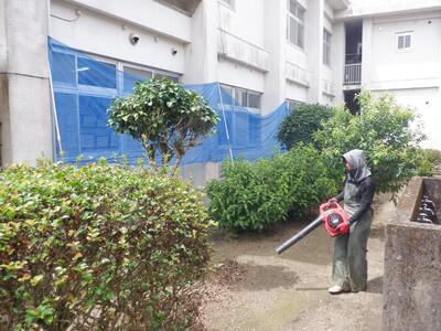 9月3日(水)、まだまだ残暑が続く中、環境整備員の方が中庭周辺の剪定作業及び除草作業を行ってくださいました。熱中症予防ため、8月23日(土)に予定していた親子奉仕作業が延期になっていたので、大変助かりました。